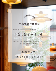 年末年始休業のお知らせ 2025年12月12日 いつも当店をご利用いただきありがとうございます。 下記期間を年末年始休暇とさせていただきます。 尚、㈱照明センターのオンラインショップは24時間ご利用いただけますので、ぜひオンラインショップをご利用ください。 ※休業期間中にいただきましたご注文お問い合わせにつきましては、1/5(月)以降に順次対応させていただきます。 ご不便をおかけいたしますがご理解の程よろしくお願い致します。